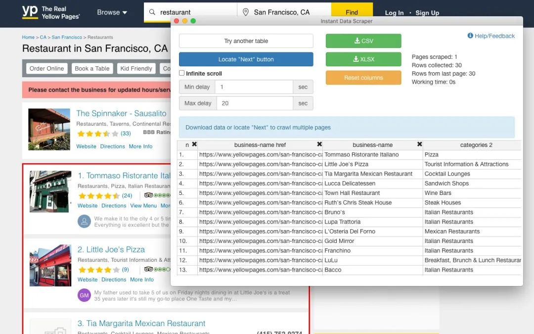 自动识别提取网页内容浏览器扩展插件「Instant Data Scraper」释放你的双手,再也不用手动复制整理网页里面你需要的内容。无需任何设置,安装好后,只要在感兴趣的页面单击插件,就能完成网页内容爬取。网页有多个表格类型的数据,可单击 “Try another table” 进行切换,直到抓取到自己感兴趣的内容为止;如网页有“更多”、“下一页”等按钮,可点击 “Locate Next button” 按钮进行手动指向,可实现自动翻页爬取。