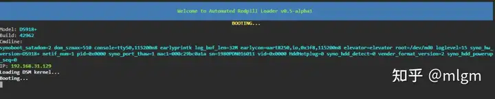 接着把NAS主机手动重启一次,编译好的引导就会自动启动,该项目编译出来的引导启动后显示的界面如下,会显示有:系统型号,系统版本,pid,vid,sn,mac等等。