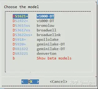 这时会显示出本机可编译黑群晖的型号,如果你的CPU比较老的话,有可能不会显示“DS918+”这个型号。我这选择的是DS918+,用方向键选好以后按回车键。