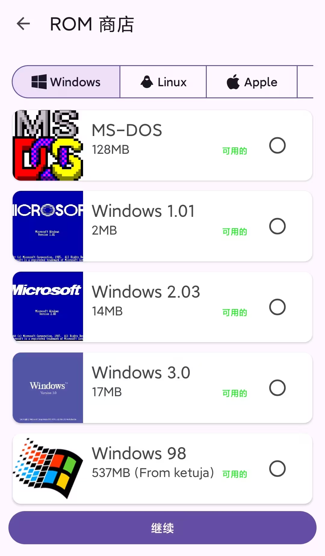 并且「VectrasVM」还提供了 ROM 商店,你可以下载各种系统安装,其中包括有:Windows、Linux、macOS,还是很方便的。支持自定义分配 CPU、内存和存储等硬件资源。