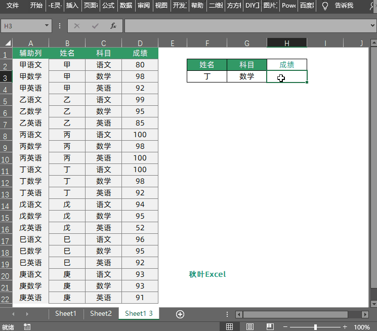 案例:根据两个条件「姓名」和「科目」,查找「成绩」。