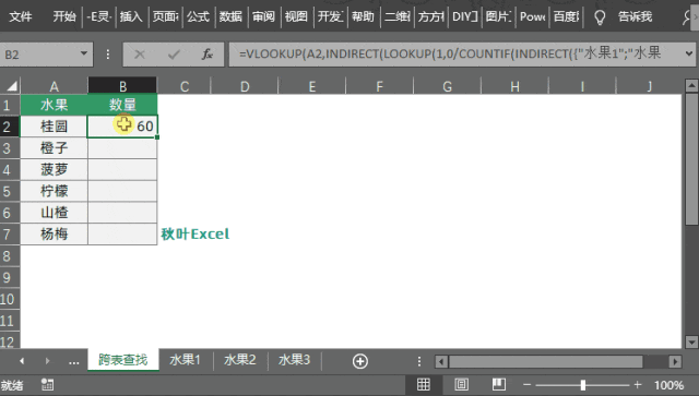 =VLOOKUP(A2,INDIRECT(LOOKUP(1,0/COUNTIF(INDIRECT({"水果 1";"水果 2";"水果 3"}&"!A:A"),A2),{"水果 1";"水果 2";"水果 3"})&"!A:B"),2,0)