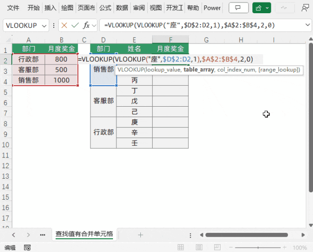 如果查找值也存在合并单元格,可以用两个 VLOOKUP 嵌套完成查找。