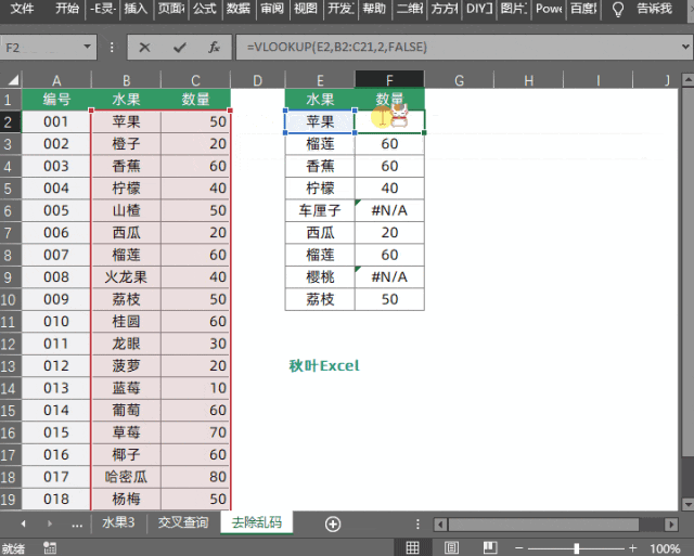 公式说明:先用 SUBSTITUTE 函数将「橙子 」后面的空格替换成空,再用 VLOOKUP 查找。同理,如果是不可见字符,则使用 CLEAN 函数处理数据。