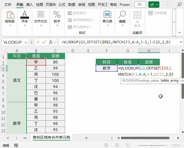 如果查找值也存在合并单元格,可以用两个 VLOOKUP 嵌套完成查找。
