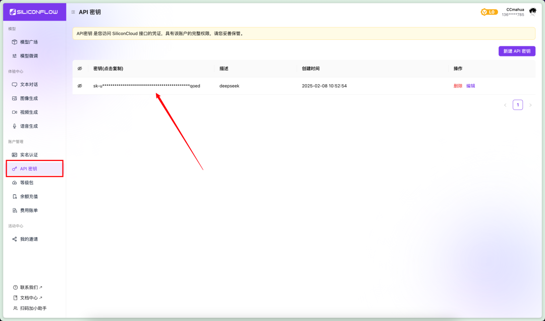 进入左侧的API秘钥,点击新建秘钥后复制秘钥