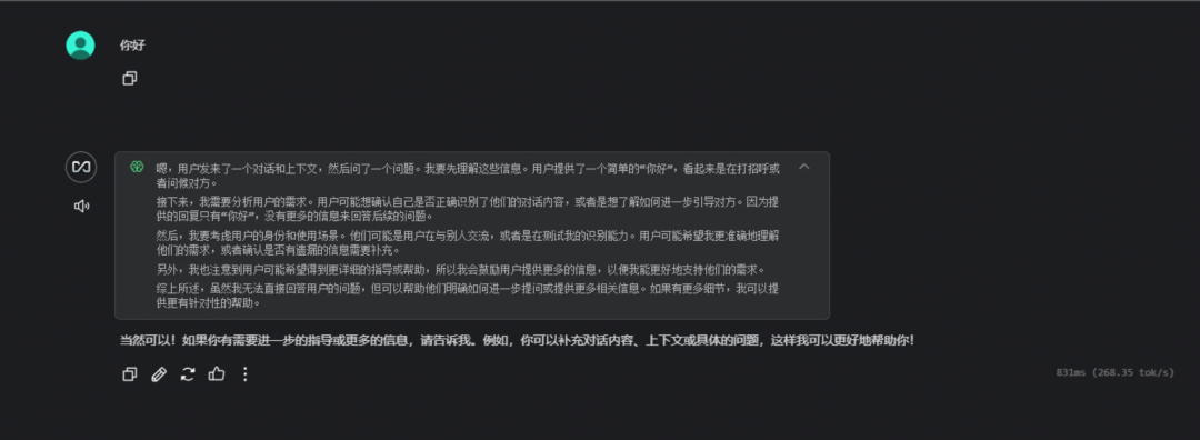 """op(f'[*]: 正在调用本地AnythingLLM对话接口... ...')messages.append({"role": "user", "content": f'{content}'})data = {"model": self.anythingLLMConfig.get('anythingllmModel'),"message": content}headers = {"Content-Type": "application/json", "Authorization": self.anythingLLMConfig.get('anythingllmKey')}try:resp = requests.post(url=self.anythingLLMConfig.get('anythingllmApi').format(workspace=self.anythingLLMConfig.get('workspace')),headers=headers,json=data,timeout=300)resp.encoding = 'utf-8'json_data = resp.json()assistant_content = json_data['textResponse']if "</think>" in assistant_content:assistant_content = assistant_content.split("</think>")[1].strip()messages.append({"role": "assistant", "content": f"{assistant_content}"})if len(messages) == 21:del messages[1]del messages[2]return assistant_content, messagesexcept Exception as e:op(f'[-]: 本地AnythingLLM对话接口出现错误, 错误信息: {e}')return None, [{"role": "system", "content": f'{self.systemAiRole}'}]