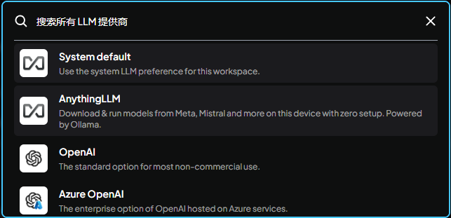 安装完成,进入 AnythingLLM 界面,这里需要选择一个默认的大模型。