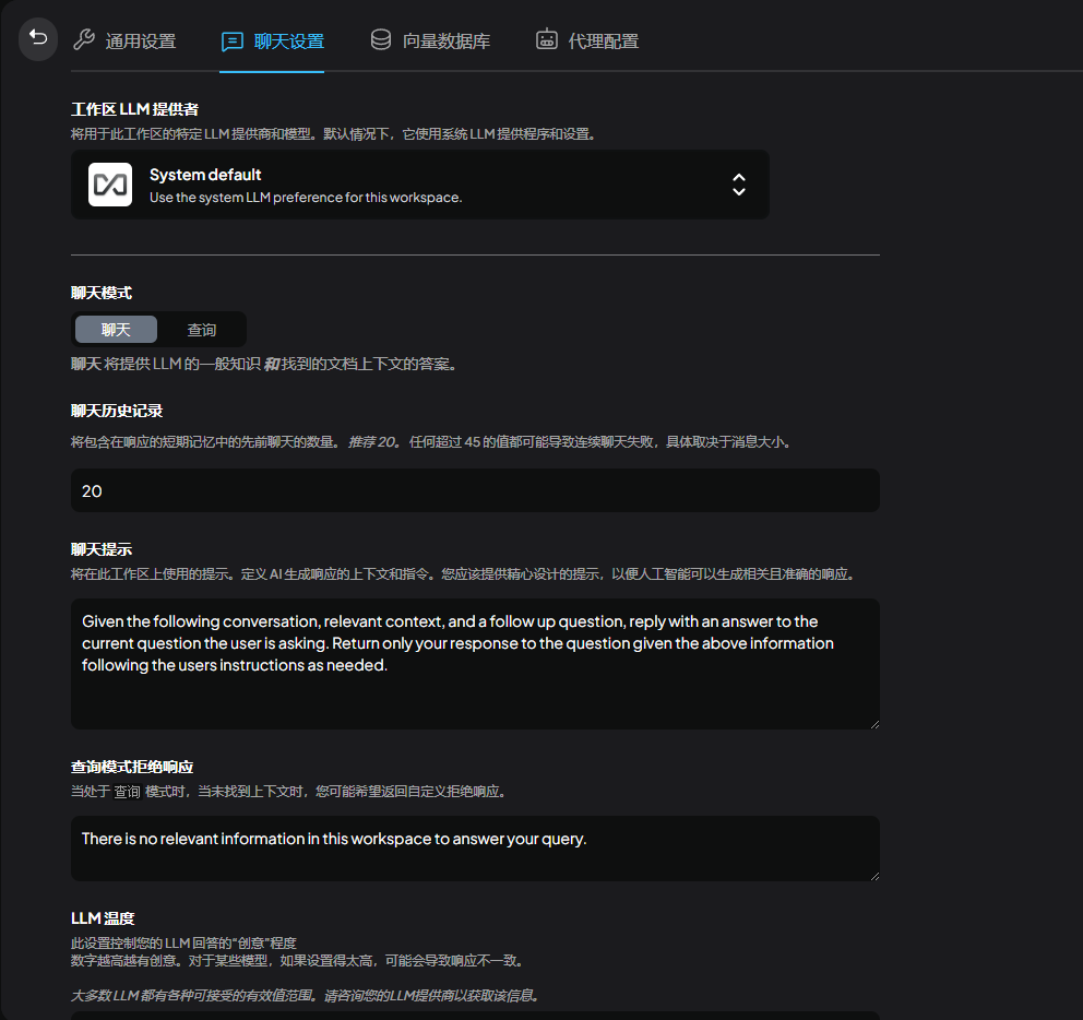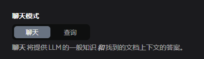 模式分聊天和查询,查询表示只使用查询上下文功能(需要有自己上传的文档),聊天表示使用聊天功能+查询