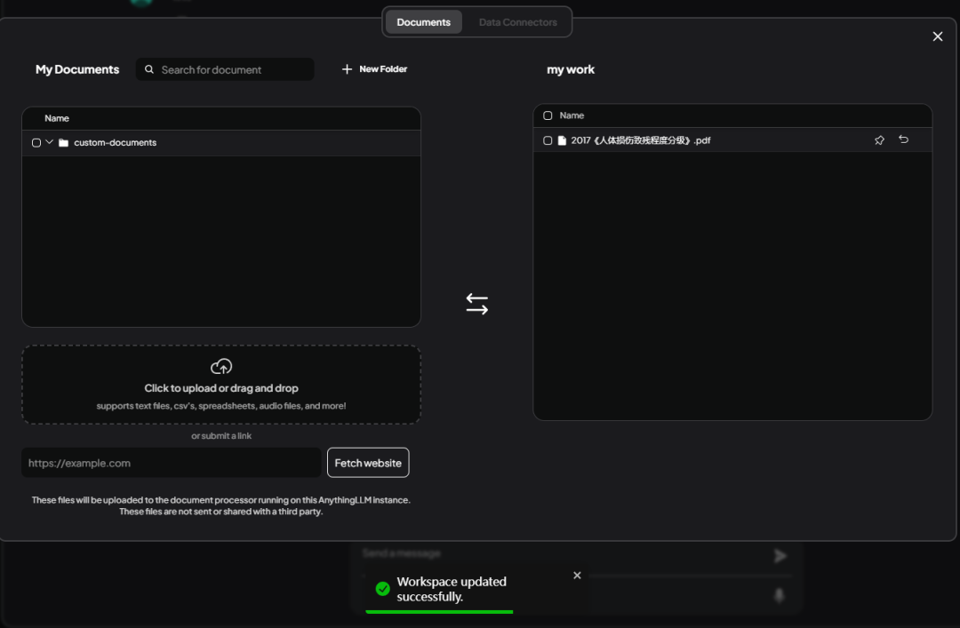 接下来需要给知识库投喂资料,点击工作区旁的上传按钮