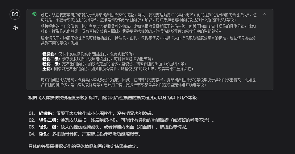 先来看下效果,这是我上传了一份《人体损伤致残程度分级》资料询问后的结果: