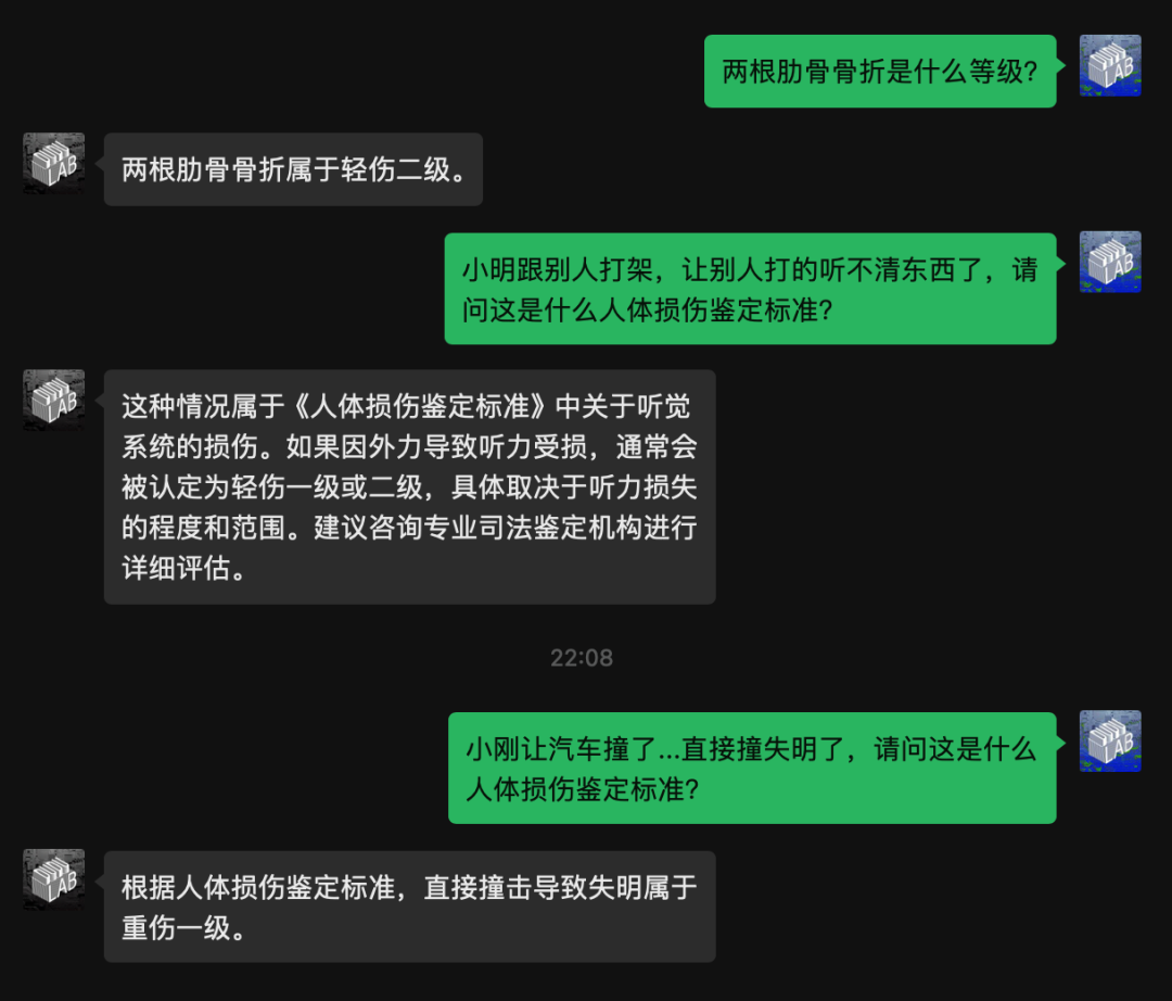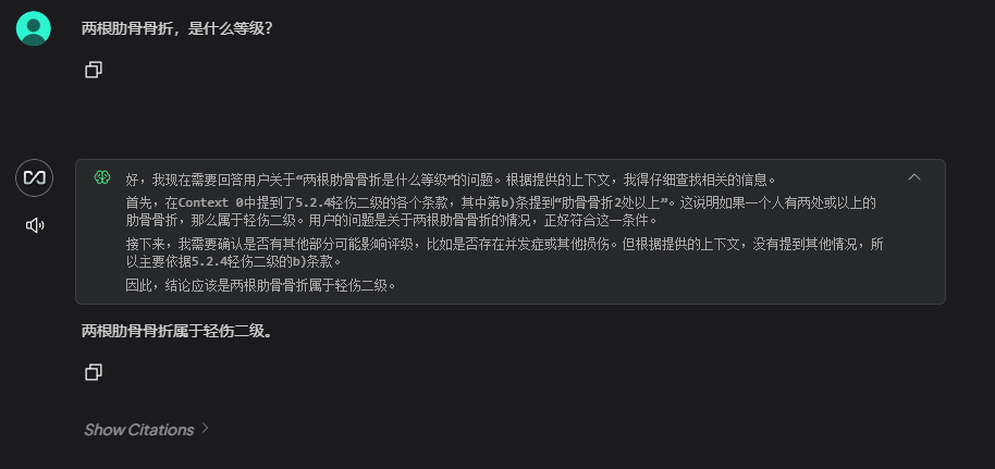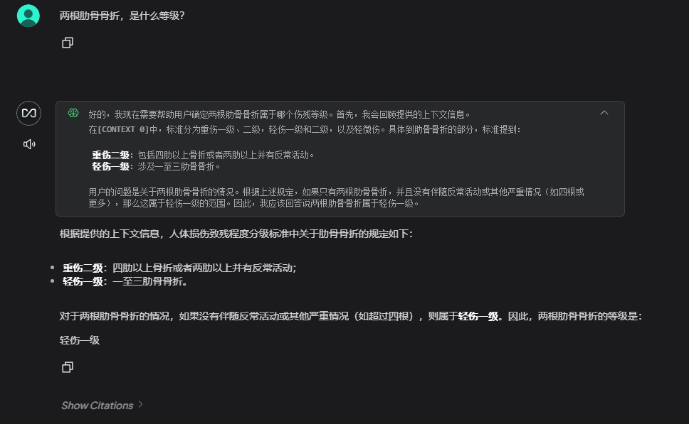 先来看下效果,这是我上传了一份《人体损伤致残程度分级》资料询问后的结果: