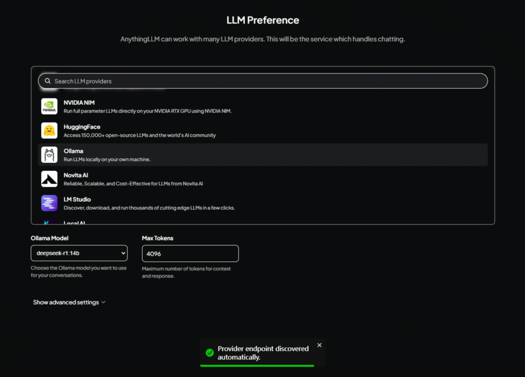 安装完成,进入 AnythingLLM 界面,这里需要选择一个默认的大模型。