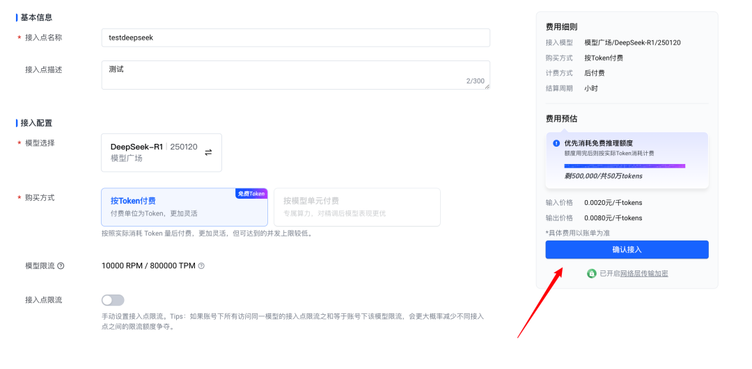 这里比较特殊,火山方舟模型名称需要填写接入点ID。我们需要去平台上创建接入点。
