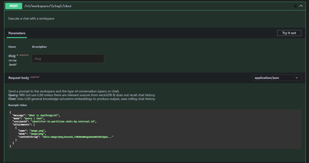 接着向下找到/v1/workspace/{slug}/chat这个API