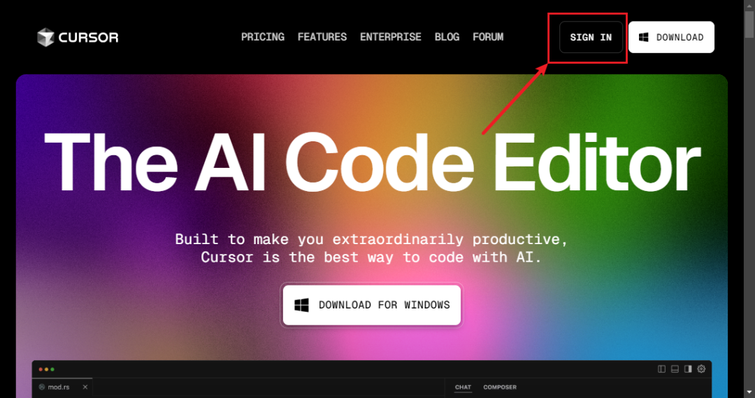 首先,访问 Cursor 官网:https://www.cursor.com。