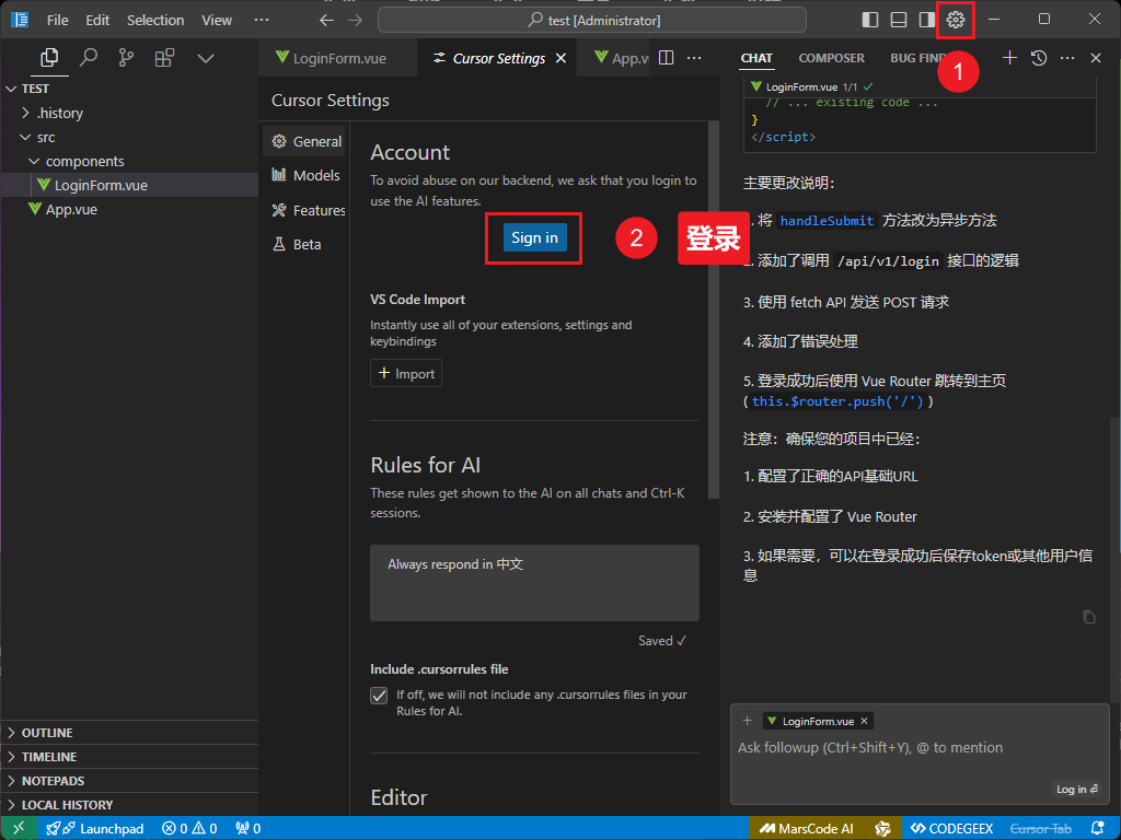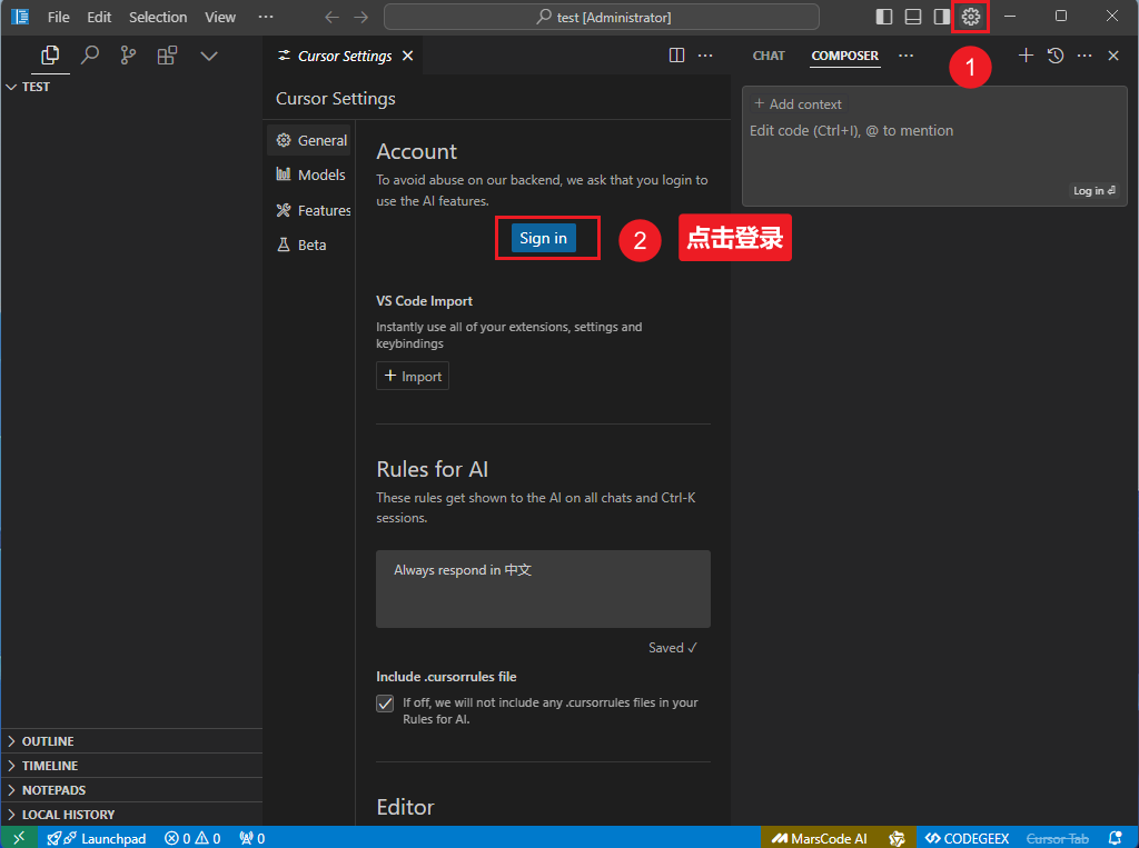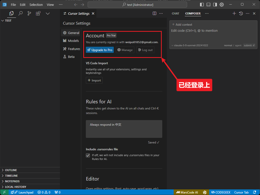 回到 Cursor,你会发现已经成功登录,可以开始使用了。