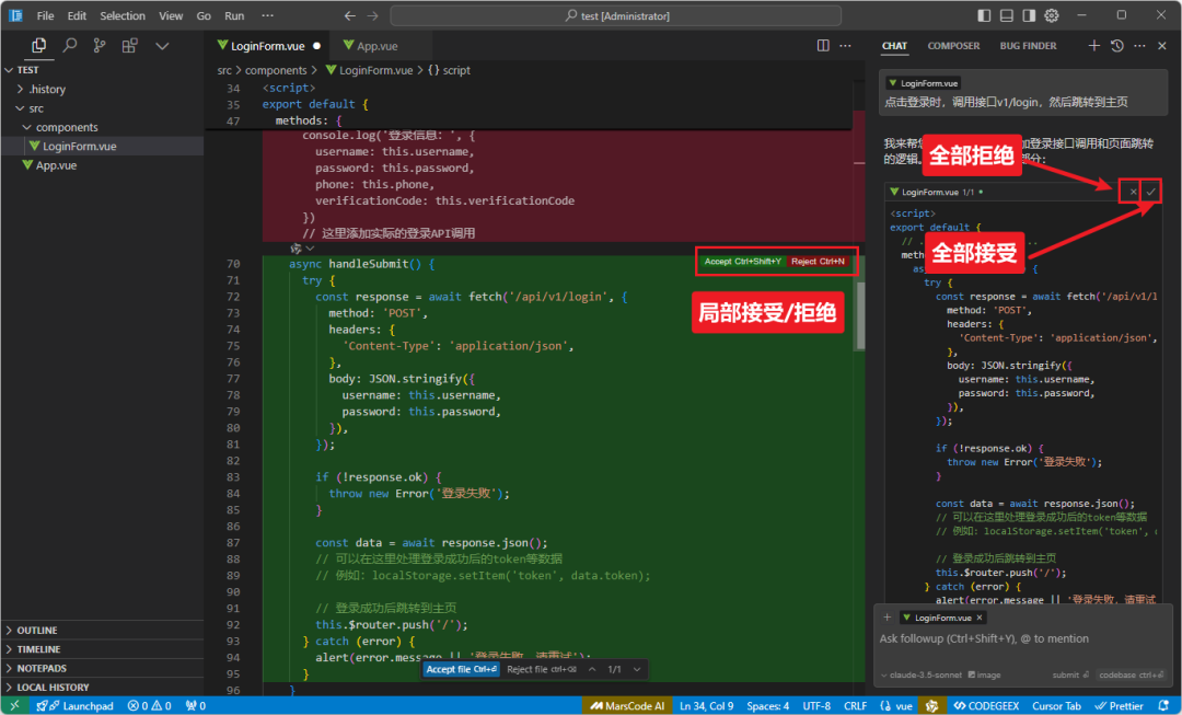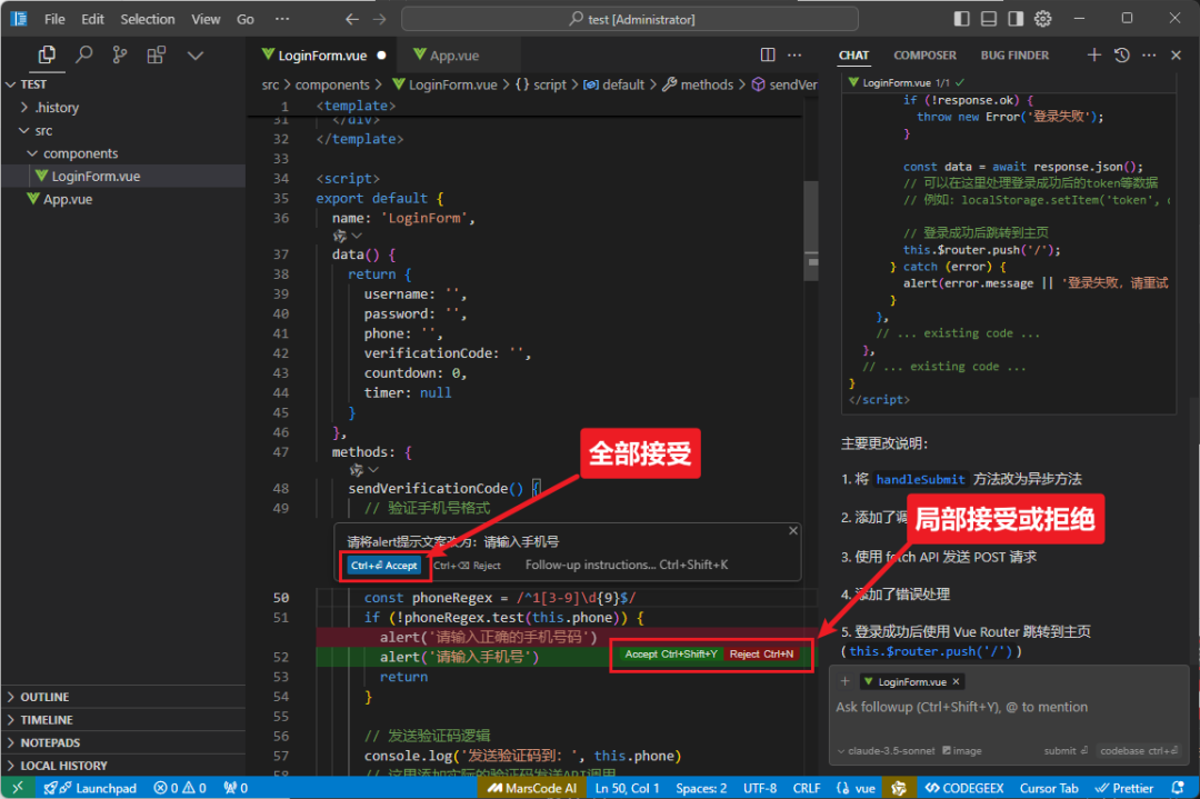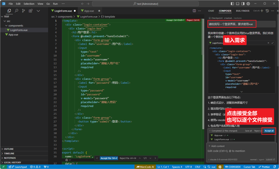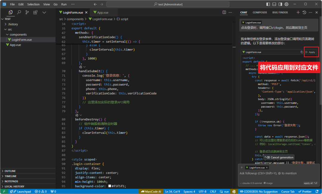 当你对生成的代码满意时,只需点击“Apply”按钮,Cursor 就会将代码写入相应的文件。Cursor 非常智能,它会自动识别代码应该写入哪个文件,你只需点击“Apply”按钮确认即可。
