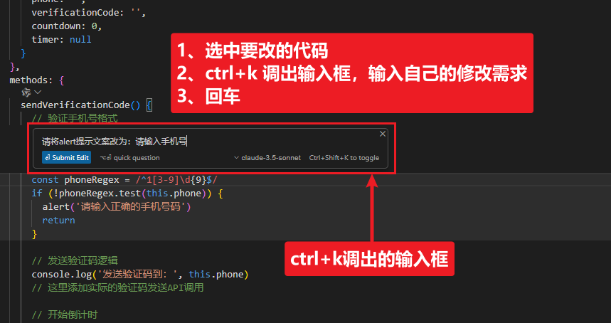 Ctrl + K,输入你的修改需求,Cursor 会基于选中的代码块进行修改。这种方式上下文明确,修改范围更小,结果更精准可控。