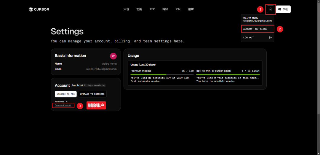 在浏览器中访问你的 Cursor 账户,点击右上角的头像,选择“Account Settings”,进入账户设置页面。然后,删除你的账户。为了确认删除操作,你需要输入“Delete”进行验证。