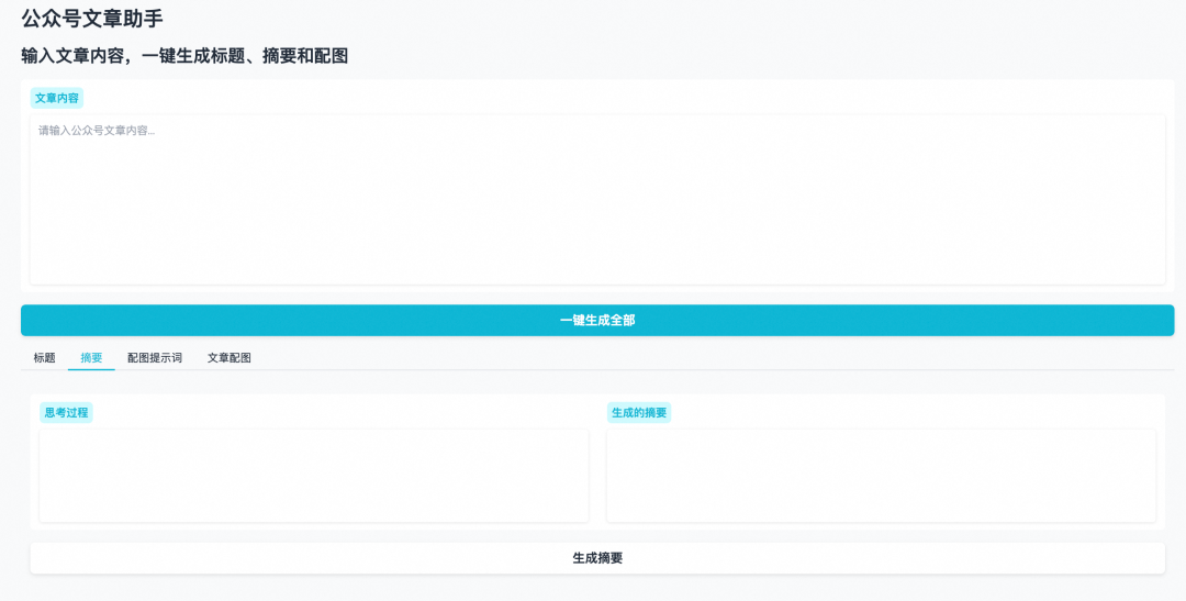 功能均可正常运行,生成的标题、摘要、Prompt 及配图符合预期。