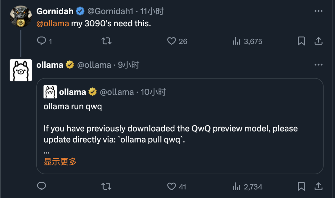 Ollama 以其出色的效率和易用性而备受赞誉。 在 QwQ-32B 发布后不久,Ollama 迅速宣布支持该模型,进一步降低了用户体验最新 AI 技术的门槛,使得人人都能轻松上手体验 QwQ-32B 的强大功能。