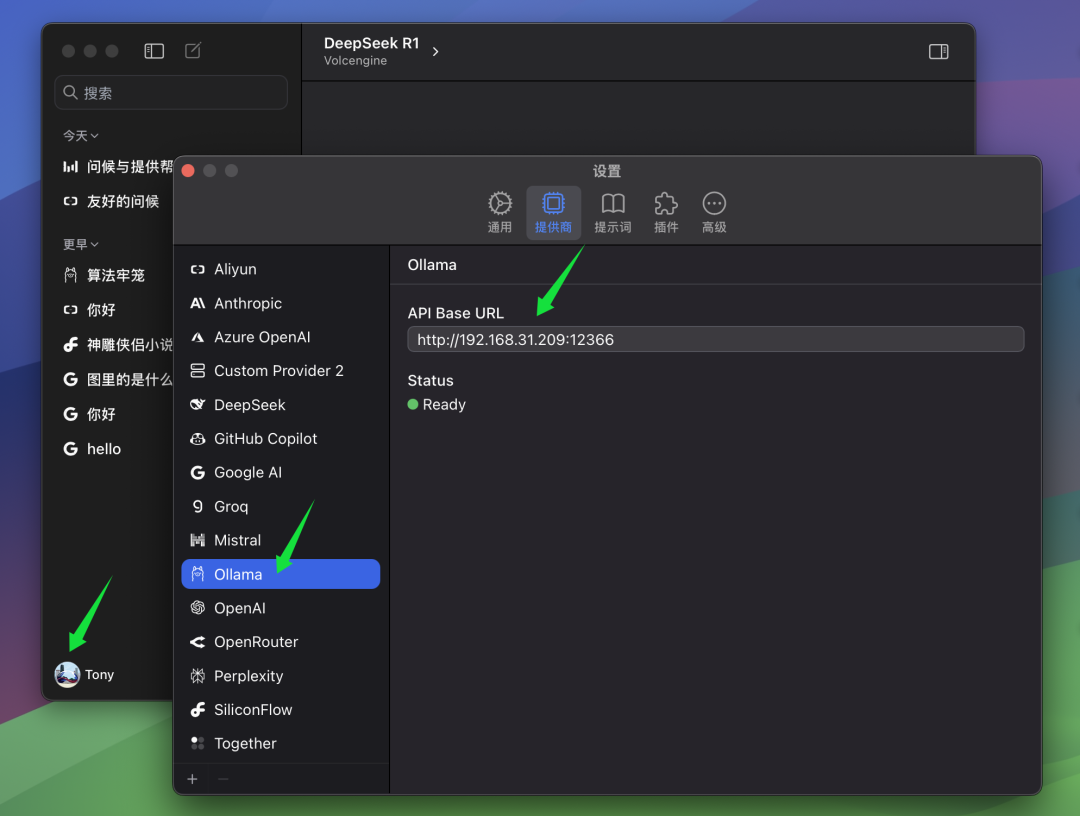 但如果您像笔者一样,将 Ollama 服务安装在另一台电脑上(例如服务器),而 ChatWise 客户端运行在本地电脑上,那么您需要手动修改 ChatWise 的 BaseURL 设置, 以便客户端能够连接到远程 Ollama 服务。 在 BaseURL 设置中,您需要填写运行 Ollama 服务的计算机的 IP 地址,以及您在 Ollama 服务端配置的端口号。 Ollama 默认端口为 13434,如果您没有进行特殊配置,则使用默认端口即可。