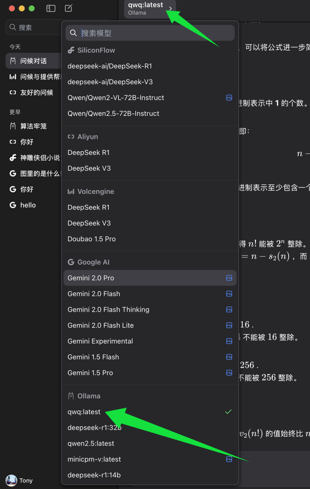 在 ChatWise 的模型选择列表中,找到 Ollama 模型分类,并在其下方选择 qwq:latest。 qwq:latest 代表 QwQ-32B 模型的最新版本,通常也是 4-bit 量化版本。 选择 qwq:latest 后,您就可以在 ChatWise 客户端中开始体验 QwQ-32B 模型的强大功能了。