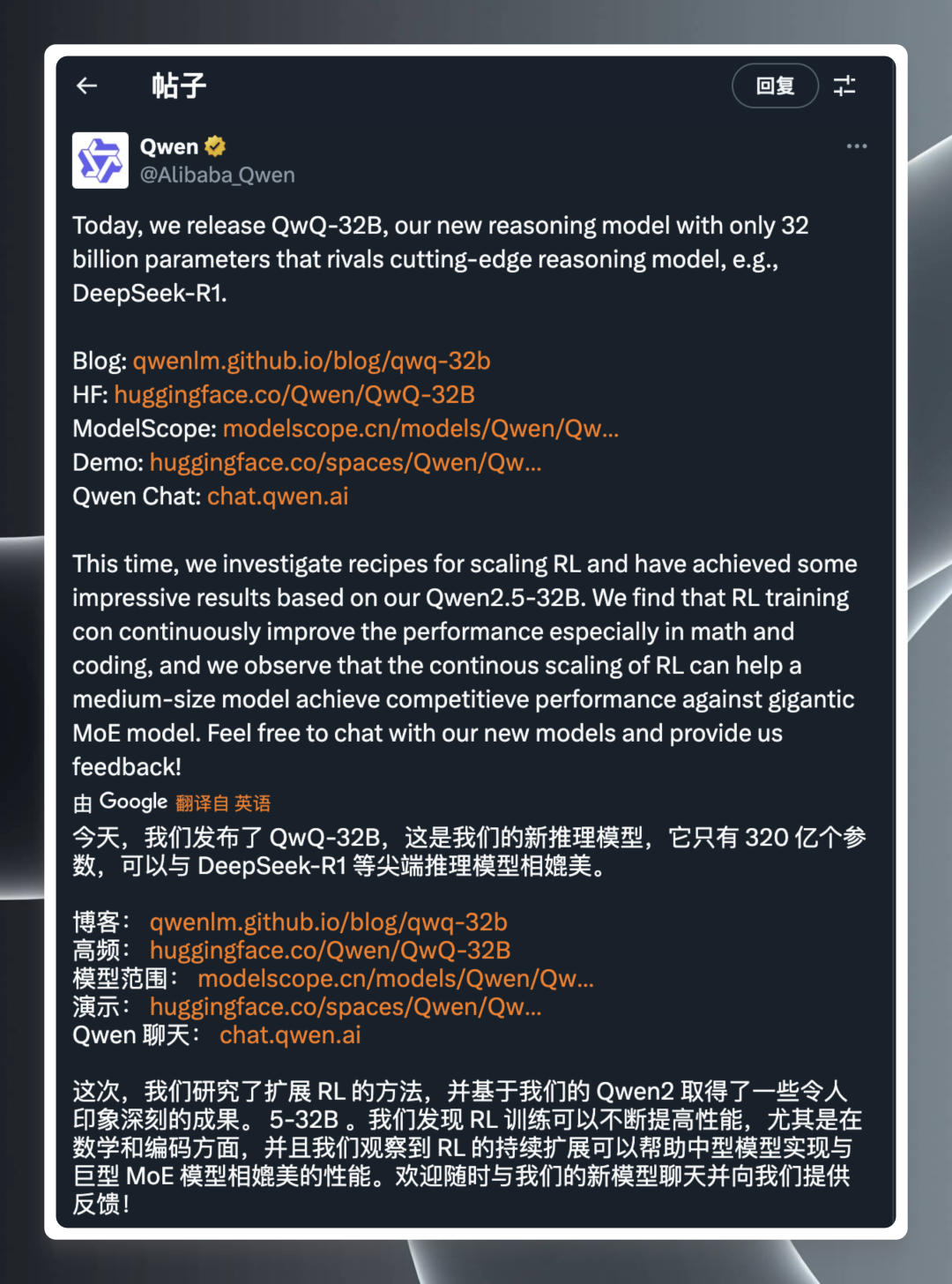 根据官方发布的公告,QwQ-32B 是一款参数规模仅为 320 亿的推理模型,却宣称能够匹敌 DeepSeek-R1 等业界领先的尖端模型。 这则消息犹如一颗重磅炸弹,瞬间引爆了技术社区,并随附了指向官方博客、Hugging Face 模型库、模型下载、在线演示及使用网站的链接,方便用户进一步了解和体验。