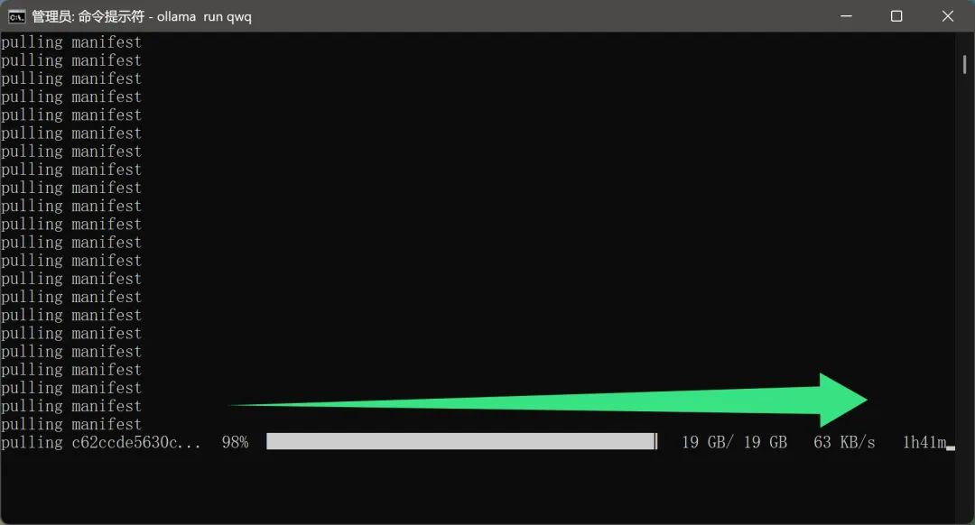 Ollama 将自动开始从云端下载 QwQ-32B 模型文件,并在下载完成后自动启动模型运行环境。