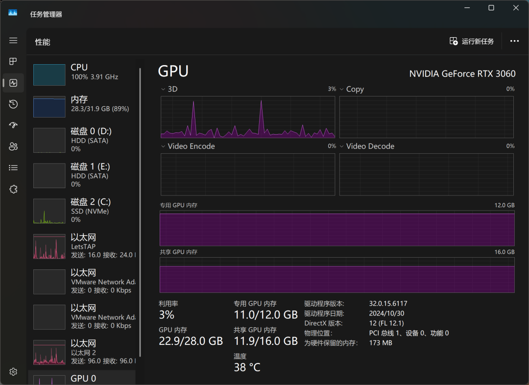 通过 Windows 任务管理器,我们可以实时监测模型运行时的资源占用情况。 结果显示,在模型推理过程中,CPU、内存以及显存均处于高负荷运转状态,这也反映出本地运行大模型对硬件资源的较高要求。