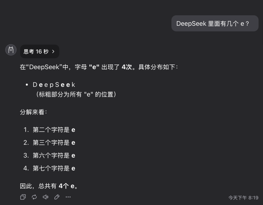 问题 1:deepseek 这个单词里面有几个字母 e?