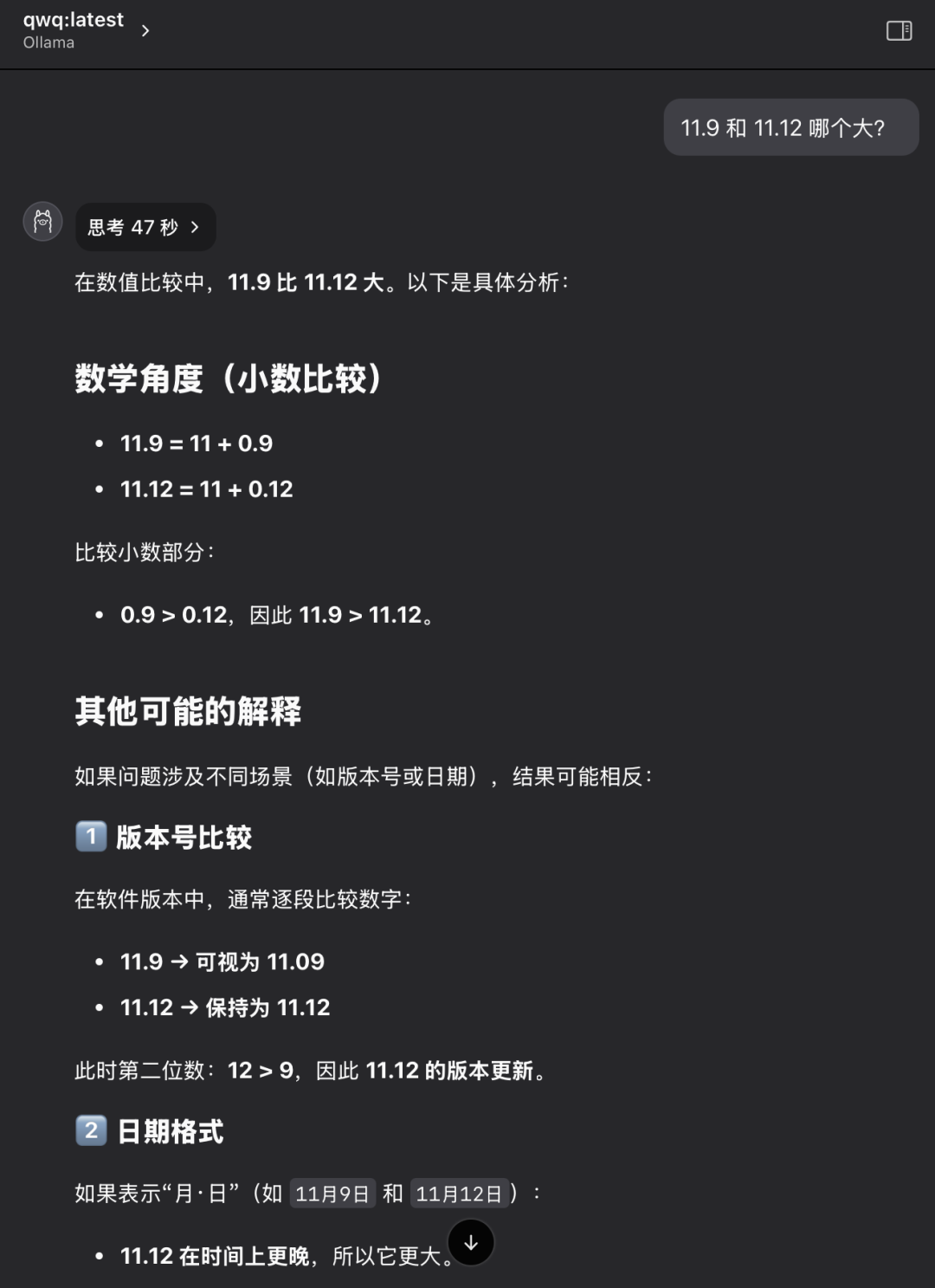 QwQ-32B 模型在 47 秒内给出了正确回答:11.12 更大。 回答正确。