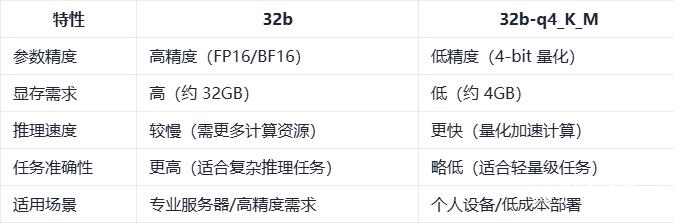 选 32b-q4_K_M: 资源有限(如 4GB 显存),或任务对精度要求不高(如聊天、文本生成)。