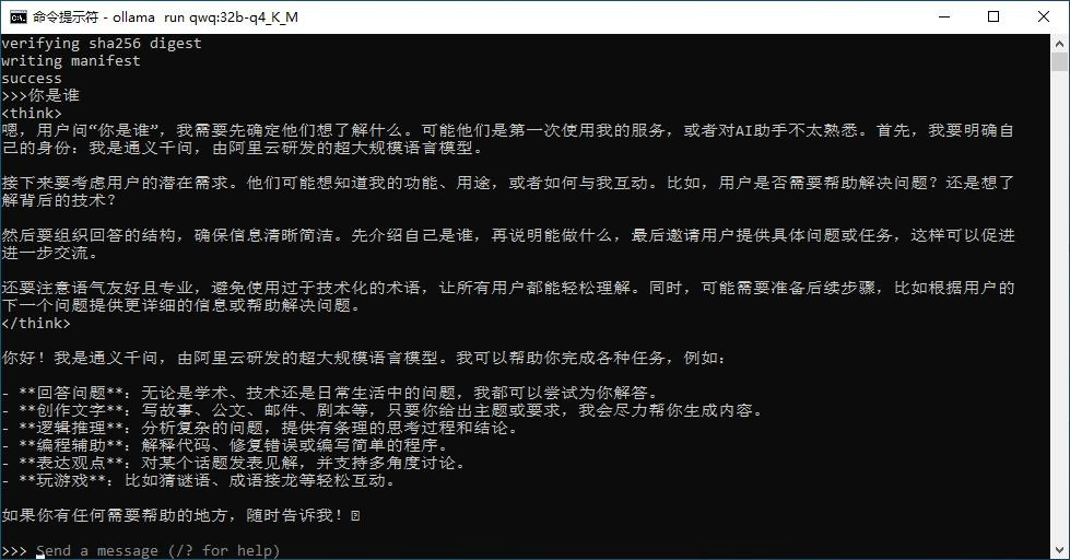 粘贴前面复制的命令(ollama run qwq:32b-q4_K_M):
