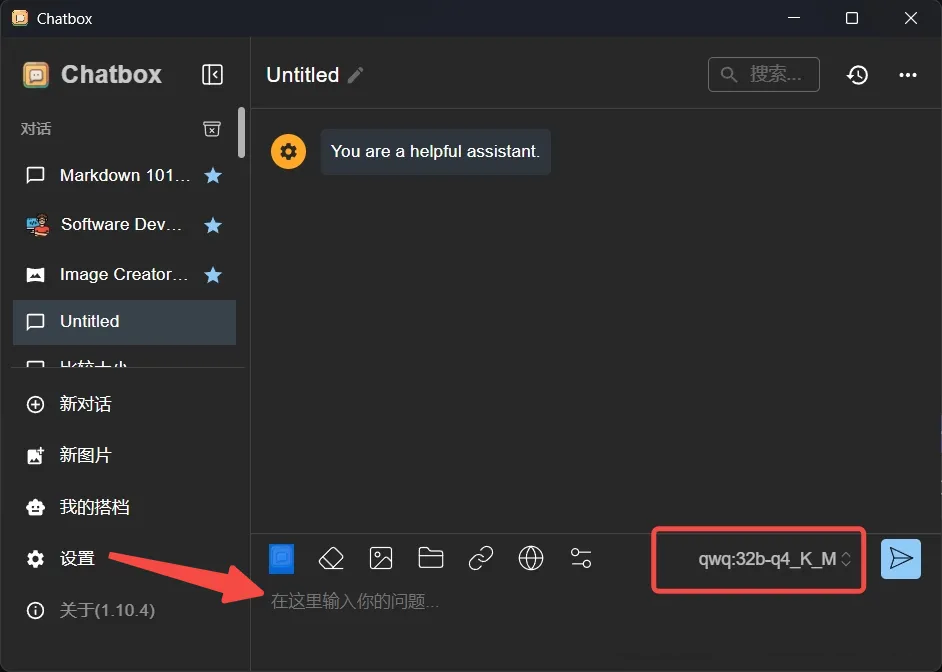 点击红框处选择 qwq:32b-q4_K_M 模型,就可以在箭头处开始和属于你的 QwQ 模型对话了。