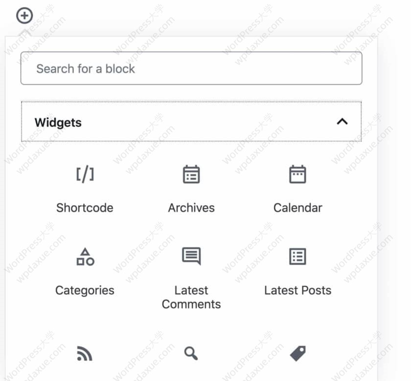 以通常的方式添加一个新块,然后选择小工具/Widgets块类型。