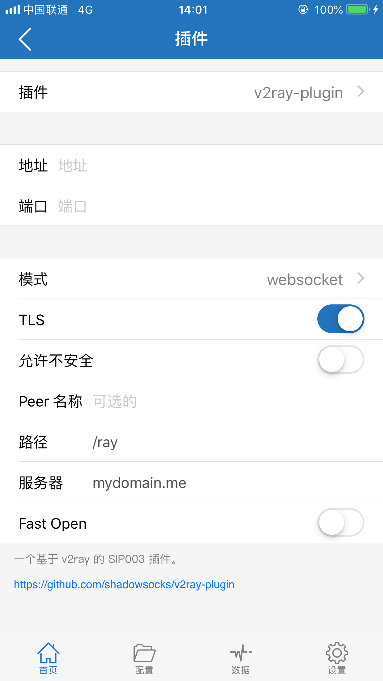 设置插件 v2ray-plugin,开启 TLS,填写路径,服务器则填写你的域名