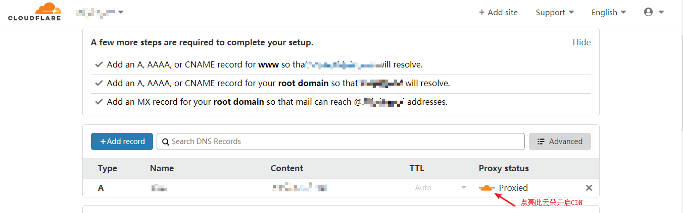 假设你的是域名是 mydomain.me,且已经在 Cloudflare 上设置好 A 记录解析