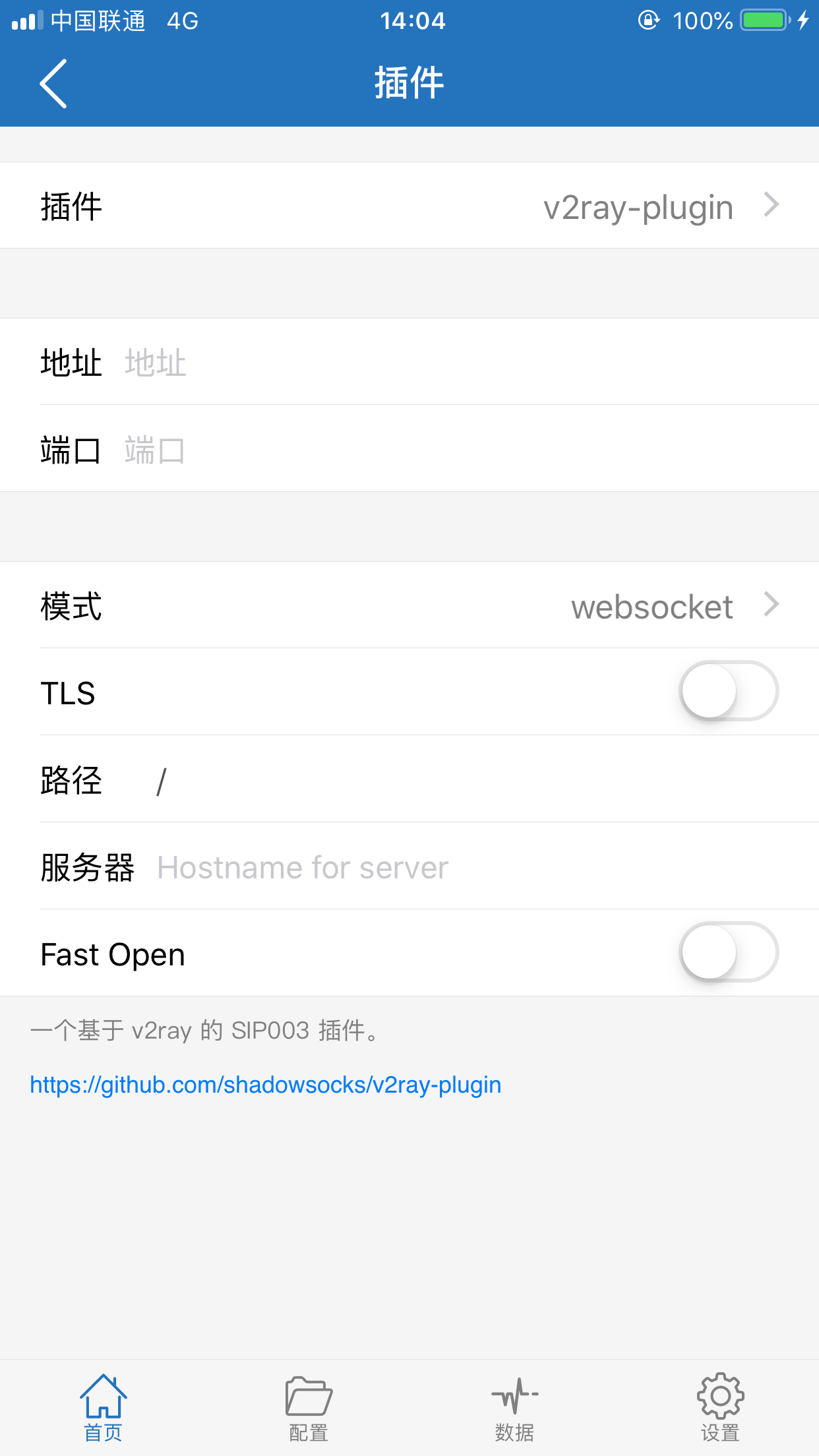 设置插件 v2ray-plugin,开启 TLS,填写路径,服务器则填写你的域名