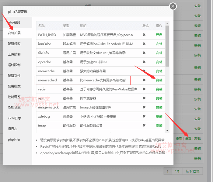 以老魏目前使用的php版本为例,正确安装方法是在“软件管理”的php7.0>设置中,找到“安装扩展”右侧的memcached,安装。这才是正确的memcached组件。安装完成后,再返回看到上图蓝色M字样的memcached已经自动安装上去了,无需人工干预。