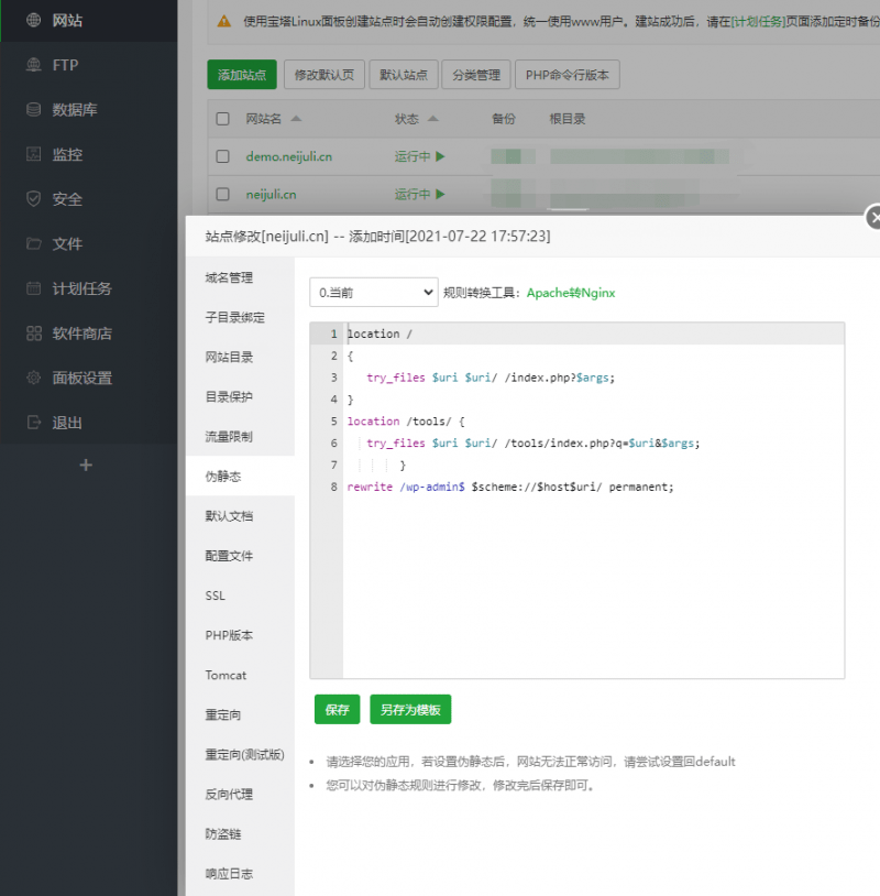 由于我用的是nginx,不修改会导致有些页面404跳转错误。我在宝塔自带的wordpress伪静态的基础上进行了一些增添。