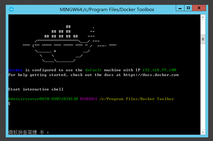 4、然后重新打开桌面上的Docker Quickstart会出现如下界面