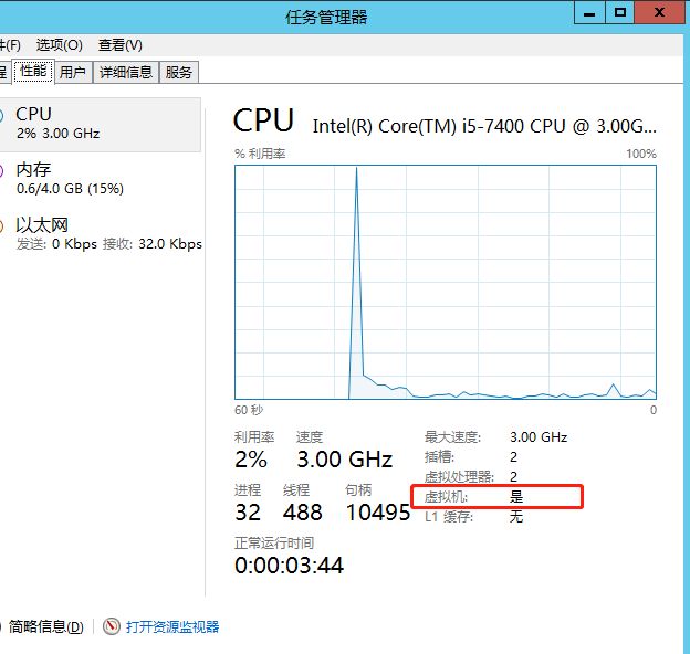 1、打开任务管理器选择性能选项卡查看是否开启了虚拟化