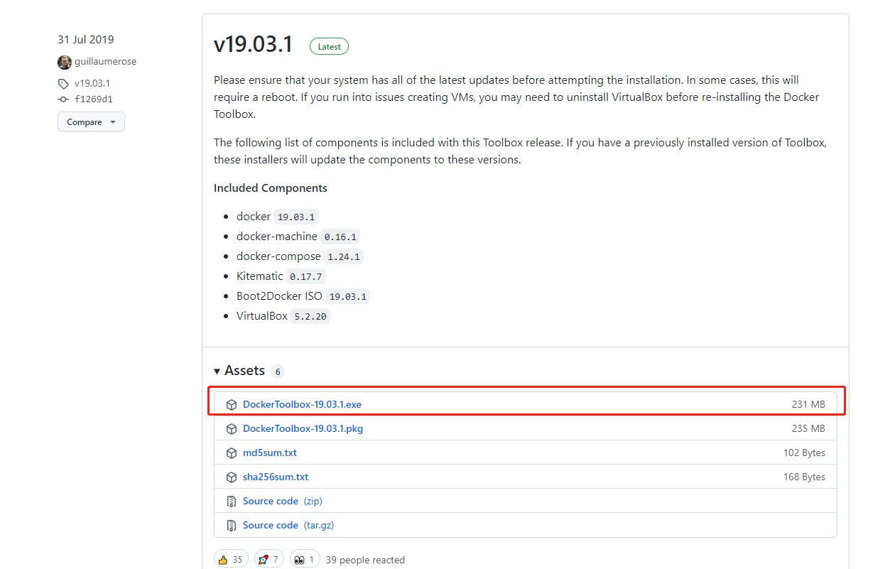 下载地址:https://github.com/docker-archive/toolboax/releases      (选择 V19.03.1 exe安装包)